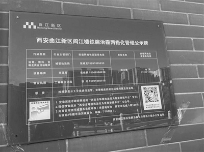 西安曲江新區(qū)閱江樓酒店門口的鐵腕治霾網(wǎng)格化管理公示牌,二維碼方便市民監(jiān)管和舉報 。