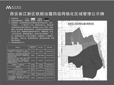 ?西安曲江新區(qū)鐵腕治霾四級網(wǎng)格化區(qū)域管理公示牌。