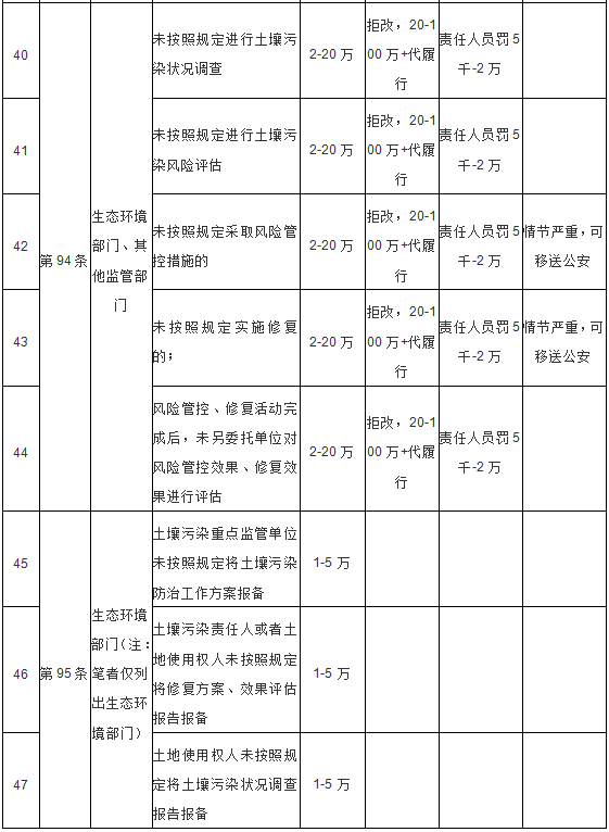 《土壤污染防治法》列舉了近50種環(huán)境違法行為,其中對應(yīng)的行政執(zhí)法主體包括生態(tài)環(huán)境主管部門、農(nóng)業(yè)農(nóng)村主管部門、林業(yè)與草原主管部門、自然資源主管部門、工業(yè)和信息化主管部門等等。《土壤污染防治法》在法律責(zé)任方面擴(kuò)充了行政拘留的適用范圍,并對多個環(huán)境違法行為設(shè)定“雙罰”,加大了對違法者的處罰力度。