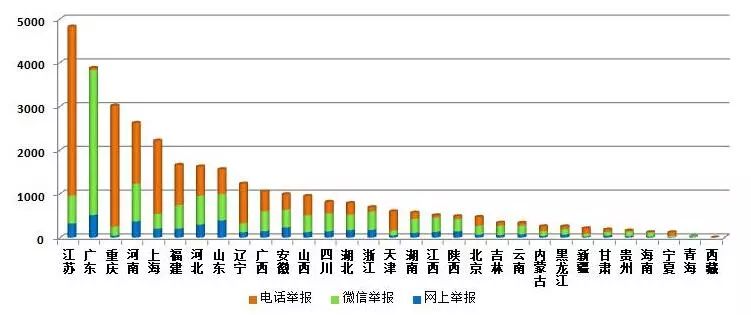 從各地區(qū)不同渠道舉報數量看,江蘇、重慶電話舉報量較多,廣東主要以微信舉報為主,占比超過85%。