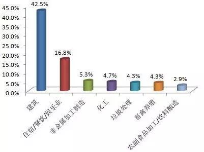 從行業(yè)類型來看,本月公眾反映最集中的行業(yè)是建筑業(yè),占42.5%,其次為住宿餐飲娛樂業(yè)和非金屬加工制造業(yè),分別占16.8%和5.3%,主要反映問題包括:夜間施工噪聲、餐飲油煙、生活娛樂噪聲、煙粉塵、工業(yè)噪聲等。