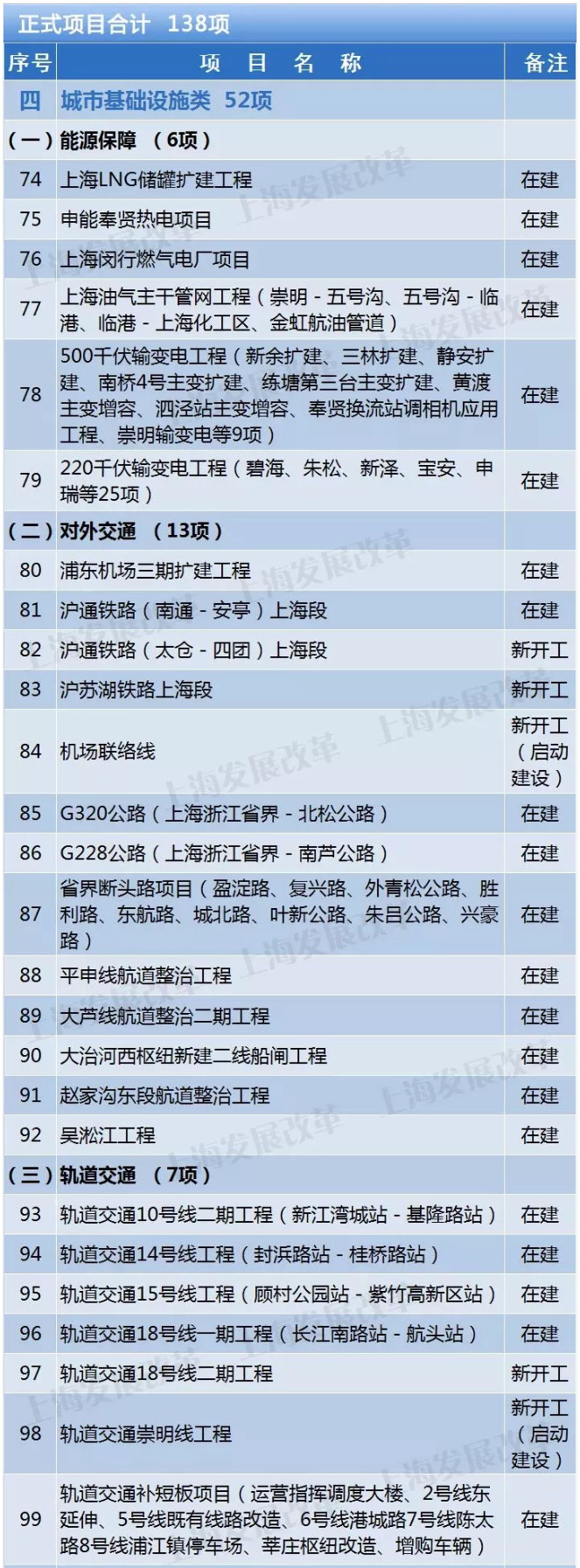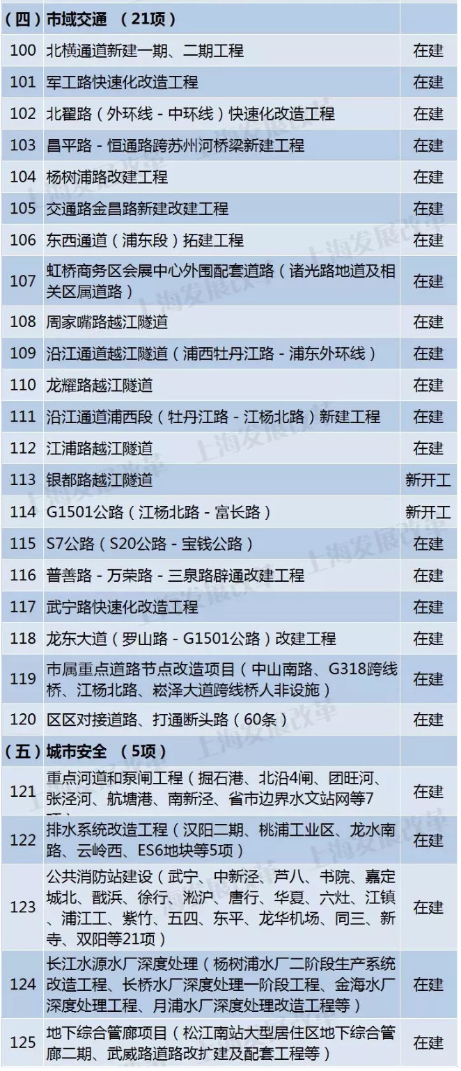 在建45項(xiàng)。包括:上海LNG儲(chǔ)罐擴(kuò)建工程、浦東機(jī)場三期擴(kuò)建工程、打通省界斷頭路、北橫通道、中心城區(qū)排水系統(tǒng)等。