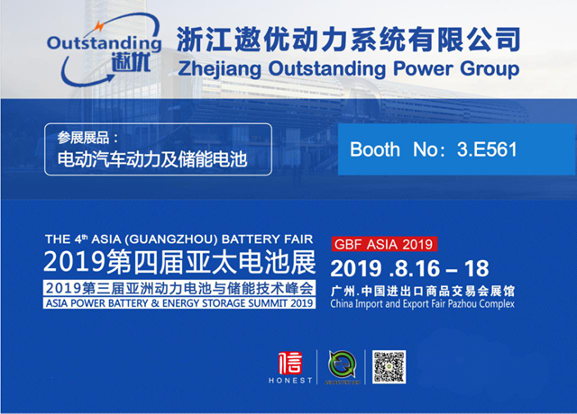 浙江遨優(yōu)動力系統(tǒng)有限公司以144平米展位重磅出席2019年8月16-18日在廣州.廣交會展館A區(qū)舉辦的GBF.ASIA 2019第四屆亞太電池展!