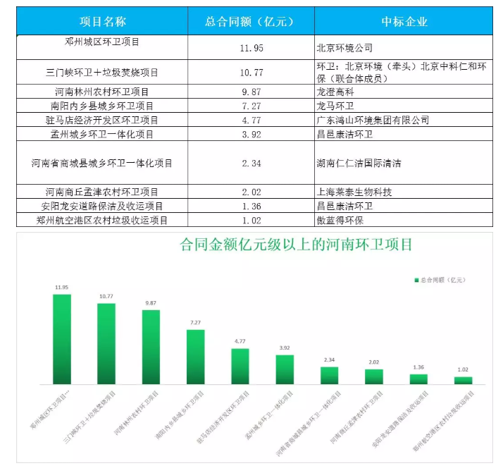 有的企業(yè)專攻大城市重點(diǎn)城區(qū)的一體化項(xiàng)目,比如北京環(huán)衛(wèi)集團(tuán)、龍馬環(huán)衛(wèi)、龍澄高科、昌邑康潔環(huán)衛(wèi)等,這些項(xiàng)目服務(wù)期限長(zhǎng),年服務(wù)費(fèi)和總合同金額也大,少則1-2億元,多則10億元以上。在大項(xiàng)目開拓上,北京環(huán)衛(wèi)集團(tuán)略勝一籌,旗下的北京環(huán)境公司斬獲鄧州城區(qū)環(huán)衛(wèi)項(xiàng)目和三門峽環(huán)衛(wèi)+垃圾焚燒項(xiàng)目,總合同金額累計(jì)達(dá)22.72億元,按照本文開端提到釋放60億元的訂單,僅北京環(huán)衛(wèi)集團(tuán)一家,便占據(jù)河南三分之一的市場(chǎng)。