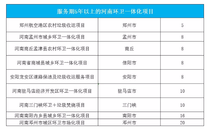 同樣矚目還有林州環(huán)衛(wèi)項(xiàng)目、南陽內(nèi)鄉(xiāng)縣環(huán)衛(wèi)項(xiàng)目、新蔡縣環(huán)衛(wèi)項(xiàng)目,年服務(wù)金額千萬級(jí)以上,合同期限10年,總合同金額超過5億元。