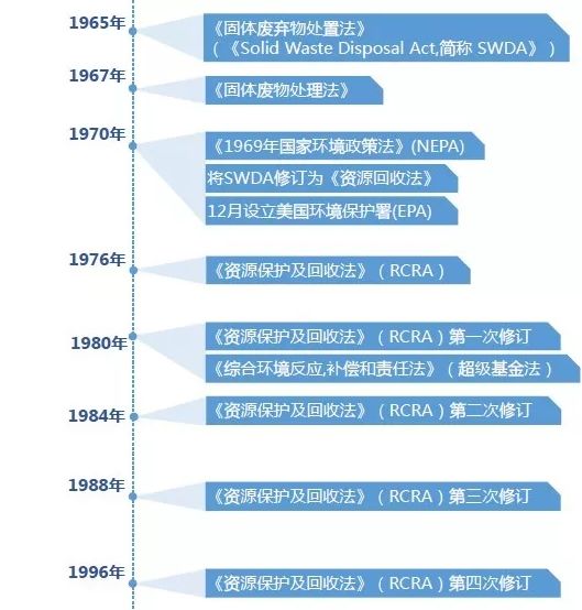 從70年代起,美國以《國家環(huán)境政策法》為基礎(chǔ),成立了國家環(huán)境保護署,制定了《固體廢物處理法》、《資源保護與回收利用法》、《危險廢物管理條例》、《綜合環(huán)境反應(yīng),補償和責任法》等諸多法律,經(jīng)過多年的發(fā)展,美國環(huán)衛(wèi)行業(yè)相關(guān)法律體系已經(jīng)非常完善。其發(fā)展脈絡(luò)如下圖所示: