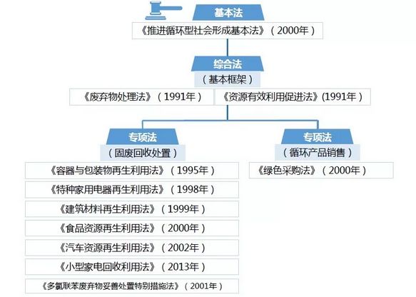20世紀90年代,日本政府又制定一系列法律:《促進再生資源利用法》、《容器包裝循環(huán)法》、《環(huán)境基本法》等。