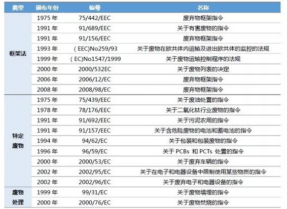 歐盟通過廢棄物框架指令確立了固廢處理的理念,建立了固廢處理體系,其相關(guān)的環(huán)境法律政策實際由兩部分組成,一部分是各類指令,從法律上直接對各成員國起約束作用,另一部分是定期頒布的環(huán)境行動規(guī)劃,對各成員國進行目標、內(nèi)容上的指導(dǎo)。