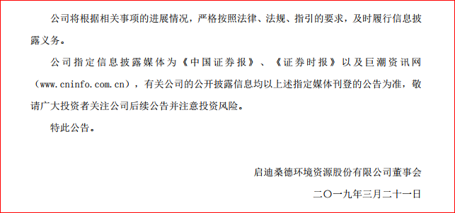 3月21日,啟迪桑德環(huán)境資源股份有限公司(簡(jiǎn)稱(chēng)“啟迪桑德”)發(fā)布公告稱(chēng),公司收到控股股東啟迪科技服務(wù)有限公司(“啟迪科服”)轉(zhuǎn)發(fā)啟迪控股股份有限公司(“啟迪控股”)下發(fā)的《啟迪控股股份有限公司關(guān)于控股股東籌劃股份變動(dòng)的通知》函件。
