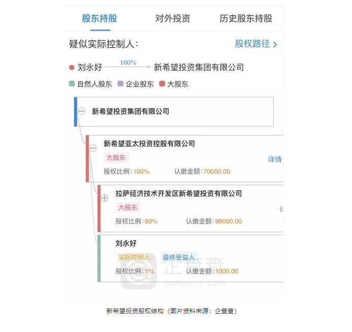 據(jù)悉,新希望投資是新希望集團(tuán)旗下的投資平臺(tái),由新希望亞太投資控股有限公司控股,注冊(cè)地址位于拉薩經(jīng)濟(jì)開(kāi)發(fā)區(qū)。經(jīng)營(yíng)范圍包括:創(chuàng)業(yè)投資(不得從事?lián):头康禺a(chǎn)業(yè)務(wù);不得參與發(fā)起或管理公募或私募證券投資基金、投資金融衍生品);股權(quán)投資(不含公募基金。不得從事證券、期貨類投資;不得參與發(fā)起或管理公募或私募證券投資基金、投資金融衍生品;不得從事房地產(chǎn)和擔(dān)保業(yè)務(wù));投資管理(不含金融和經(jīng)紀(jì)業(yè)務(wù)。不得從事證券、期貨類投資;不得向非合格投資者募集、銷售、轉(zhuǎn)讓私募產(chǎn)品或者私募產(chǎn)品收益權(quán));資產(chǎn)管理(不含金融資產(chǎn)管理和保險(xiǎn)資產(chǎn)管理)等。