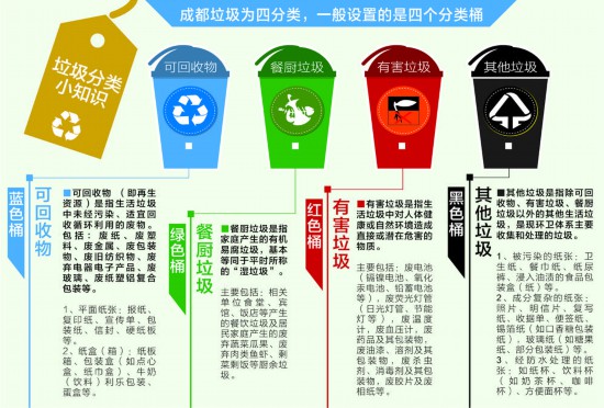 到2020年,成都將基本建立生活垃圾分類法規(guī)體系、政策體系、標準體系、設(shè)施體系和工作體系,形成以法治為基礎(chǔ)、政府推動、全面參與、城鄉(xiāng)統(tǒng)籌、因地制宜的垃圾分類制度。
