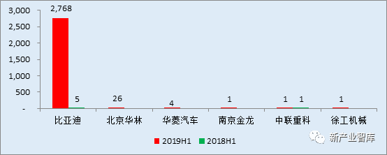 從企業(yè)生產(chǎn)端來看,2019上半年重型專用車市場生產(chǎn)企業(yè)數(shù)目由2018上半年的2家上升至6家,總產(chǎn)量由6輛快速增長至2,801輛,集中表現(xiàn)為比亞迪在此期間重型專用車產(chǎn)量的暴增。
