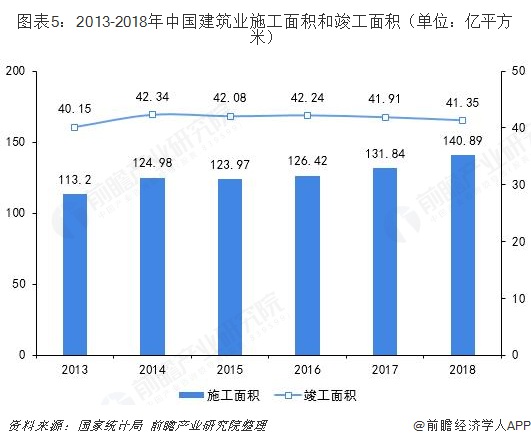 圖表5:2013-2018年中國(guó)建筑業(yè)施工面積和竣工面積(單位:億平方米)