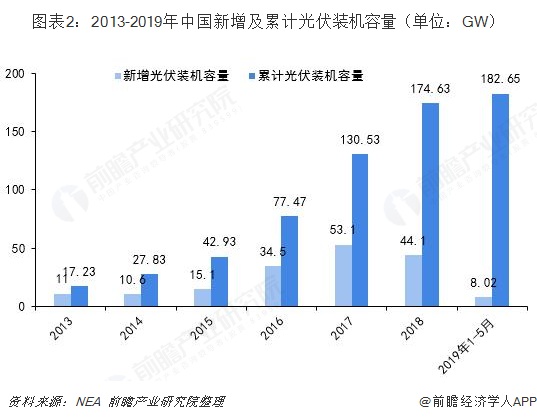 經(jīng)過(guò)全行業(yè)幾十年的努力,中國(guó)光伏產(chǎn)業(yè)在全產(chǎn)業(yè)鏈上都走到了世界前列。近年來(lái),中國(guó)光伏裝機(jī)容量不斷上升,2018年中國(guó)新增光伏裝機(jī)容量達(dá)到44.1GW,累計(jì)裝機(jī)容量達(dá)到174.63GW,連續(xù)六年穩(wěn)居全球第一。2019年1-5月,新增光伏裝機(jī)容量為8.02GW。
