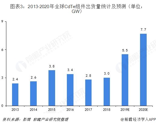 圖表3:2013-2020年全球CdTe組件出貨量統(tǒng)計(jì)及預(yù)測(cè)(單位:GW)