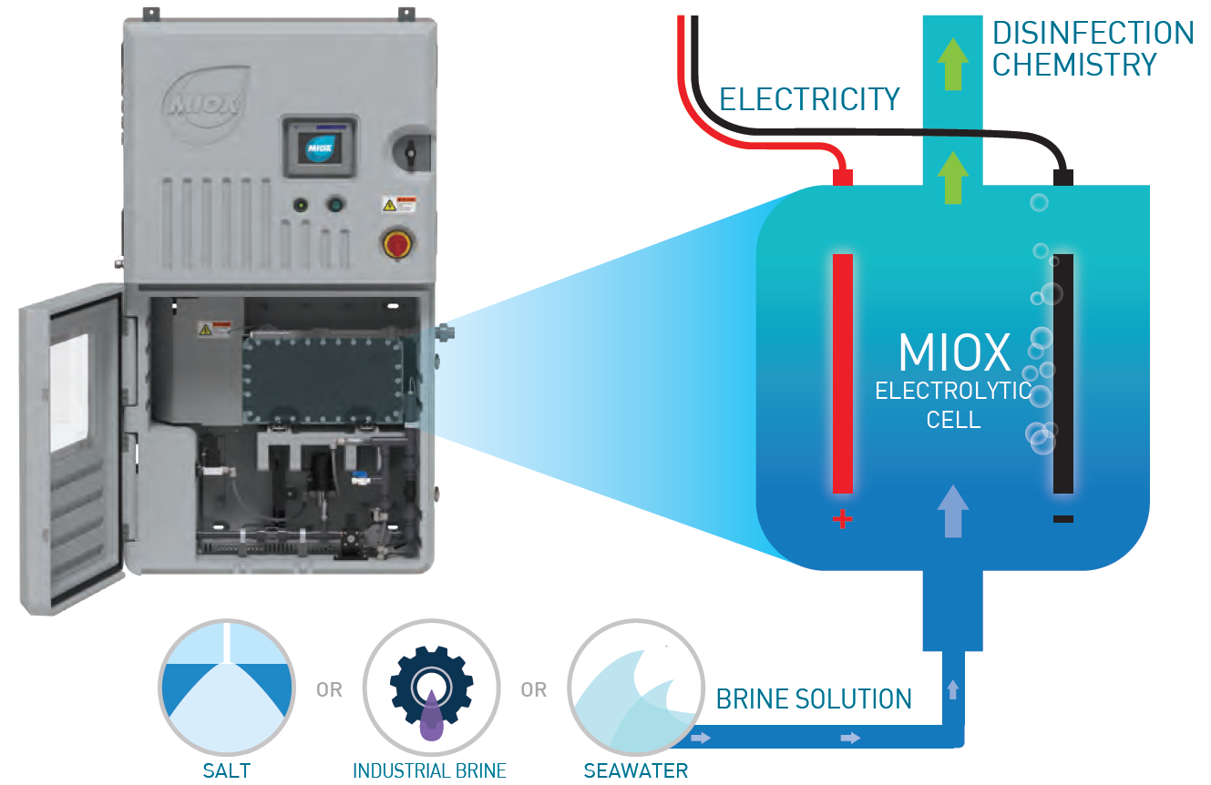 迪諾拉MIOX技術(shù)能現(xiàn)場制備混合氧化物溶液,并針對更具有挑戰(zhàn)性的應(yīng)用進行了優(yōu)化。這種混合氧化物溶液具有次氯酸鈉的所有氧化能力,同時具有過氧化氫的額外處理優(yōu)勢,包括穿透去除生物膜、有害消毒副產(chǎn)品的減少,改善氣味以及水的澄清度。此外,MIOX所具備的自清洗等獨特功能,能幫助客戶通過更低的加藥量保持更穩(wěn)定的控制和余氯濃度。
