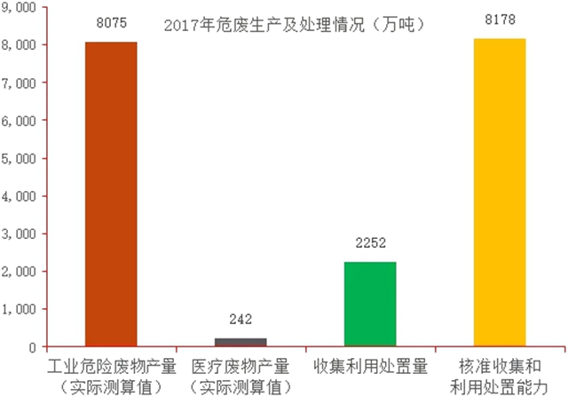 截至2017年底,全國(guó)危險(xiǎn)廢物的核準(zhǔn)收集和利用處置能力已經(jīng)達(dá)到了8178 萬(wàn)噸/年 ,但實(shí)際處置量?jī)H為 2252 萬(wàn)噸/年,產(chǎn)能利用率僅為27.08%;我國(guó)危險(xiǎn)廢物存在區(qū)域禁運(yùn)限制,導(dǎo)致各區(qū)域間過?;虿蛔惝a(chǎn)能無(wú)法共享,使該行業(yè)成為區(qū)域寡頭壟斷型行業(yè)。目前全國(guó)危廢市場(chǎng)空間已達(dá)到2000~3000億元,亟待出現(xiàn)一個(gè)具有全國(guó)產(chǎn)能布局能力的危廢處理龍頭企業(yè),引領(lǐng)行業(yè)未來(lái)向更加合理化布局的方向發(fā)展。
