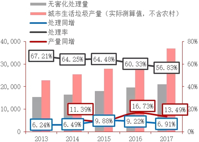 我國(guó)生活垃圾處理缺口呈現(xiàn)逐年上升趨勢(shì),其根本原因在于處理產(chǎn)能的不足,垃圾的產(chǎn)量增速已經(jīng)遠(yuǎn)高于處理增速。在產(chǎn)能利用率達(dá)到84.76%的條件下,2017年的生活垃圾處理率僅有56.83%。