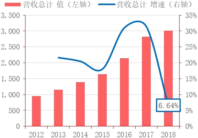 根據(jù)上市環(huán)保公司年報(bào)數(shù)據(jù),2018年環(huán)保行業(yè)上市環(huán)保公司營(yíng)收3006億元,同比增長(zhǎng)6.64%,為7年來(lái)最低水平,比上年同期下滑近25個(gè)百分點(diǎn)。