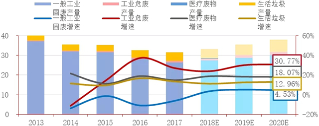 固廢處理方面,據(jù)2018年《全國(guó)大、中城市固體廢物污染環(huán)境防治年報(bào)》披露,在2013-2017的5年內(nèi),我國(guó)固體廢物產(chǎn)生量已降低了近40%,全部減量均為一般工業(yè)固體廢物類貢獻(xiàn),而危險(xiǎn)廢物與生活垃圾在幾年內(nèi)一直呈現(xiàn)高速增長(zhǎng)趨勢(shì)。