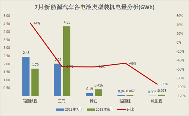 從7月各類型電池裝機(jī)量來(lái)看,僅磷酸鐵鋰依舊保持環(huán)比上漲勢(shì)頭,環(huán)比增長(zhǎng)44%。三元、錳酸鋰、鈦酸鋰三元電池均環(huán)比下跌,其中三元環(huán)比下滑54%,錳酸鋰環(huán)比下滑46%,鈦酸鋰環(huán)比下滑93%。