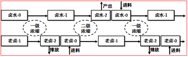 如上圖所示,老鹵和鹵水分別在正滲透膜的兩側(cè)循環(huán)流動(dòng),利用正滲透膜選擇性透過(guò)的特性,以膜兩側(cè)滲透壓差作為驅(qū)動(dòng)力,將水從鹵水側(cè)遷移到老鹵側(cè),從而達(dá)到鹵水濃縮的目的。在實(shí)驗(yàn)中,濃縮過(guò)程分兩步進(jìn)行:首先以稀釋過(guò)的老鹵(老鹵-1)作為驅(qū)動(dòng)液對(duì)納濾產(chǎn)水(鹵水-0)進(jìn)行一級(jí)濃縮,濃縮過(guò)程中膜通量會(huì)逐漸減小,到達(dá)預(yù)定值時(shí),停止?jié)饪s得到鹵水-1;然后以新的老鹵(老鹵-0)對(duì)鹵水-1進(jìn)行二級(jí)濃縮,得到老鹵-1和最終產(chǎn)物鹵水-2,如圖4所示。