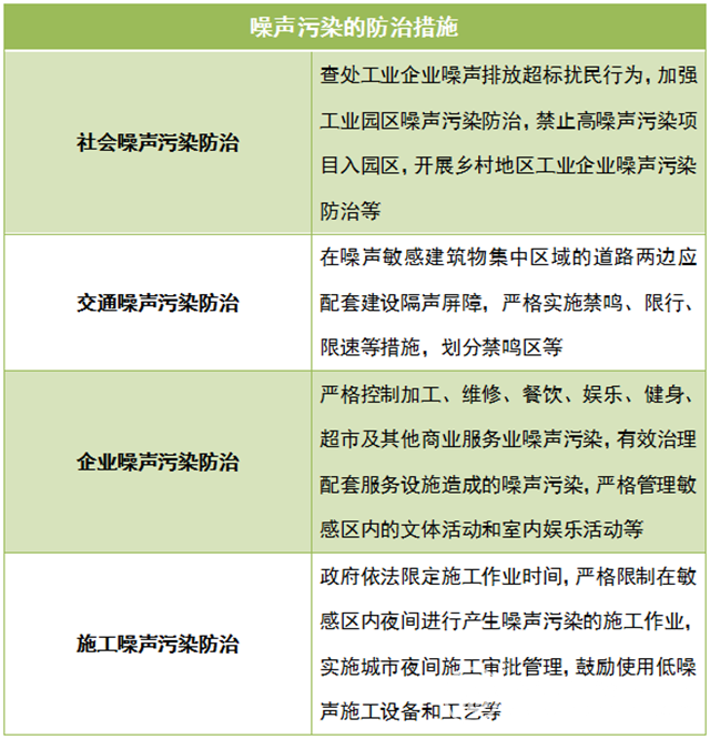 對于早噪聲污染應該怎樣防治呢?很多地方針對地方的自身情況,也出臺了噪聲污染防治和管理的辦法,還有建筑施工、社會生活固定設備和工業(yè)噪聲等專項整治行動。總體上來看,各地方對各種類型的噪聲污染防治措施大同小異,具體如下表: