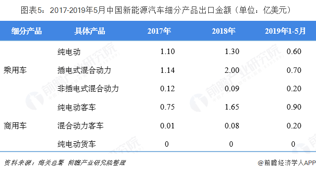 據(jù)中國海關(guān)統(tǒng)計,我國新能源汽車出口規(guī)模表現(xiàn)優(yōu)異。2018年全年出口新能源汽車14.71萬輛,同比增長39.4%;在出口金額方面,2018年我國新能源汽車出口金額為5.12億美元,同比增長63.58%。截至2019年5月,我國新能源汽車出口累計達到7.99萬輛,出口金額合計2.6億美元。