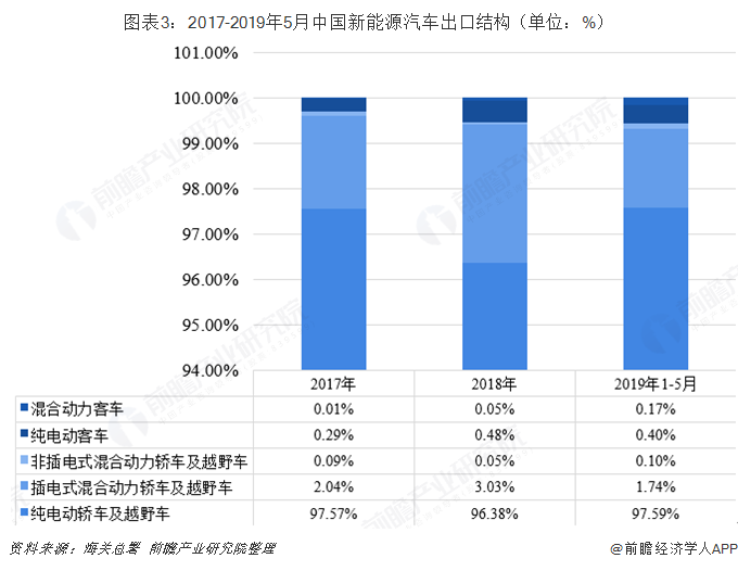 從新能源汽車出口結(jié)構(gòu)情況來看,目前我國新能源汽車出口主要以純電動轎車及越野車(即純電動乘用車)為主,其次是插電式混合動力轎車及越野車(即插電式混合動力乘用車)。