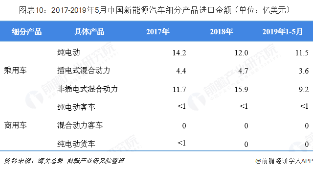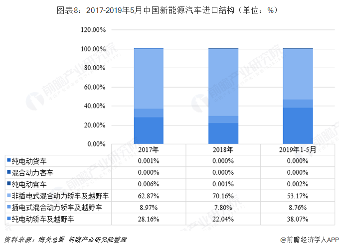 截至2019年5月,我國純電動轎車及越野車進口累計達到2.36萬輛,占新能源汽車進口量的38.07%,進口金額合計達到11.5億美元,說明純電動轎車及越野車的進口均價較往年有所上升。