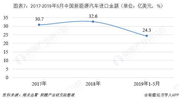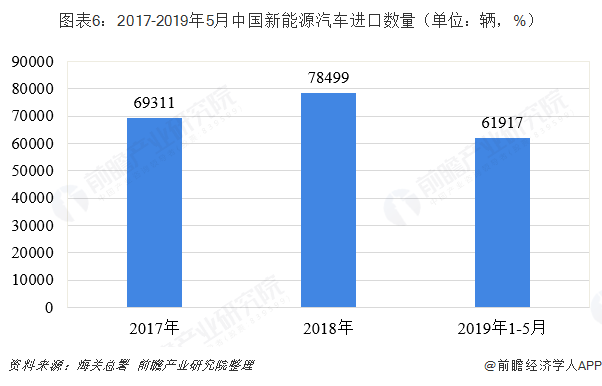 根據(jù)中國海關(guān)統(tǒng)計,我國新能源汽車進口規(guī)模呈擴大趨勢。2018年全年進口新能源汽車7.8萬輛,同比增長13.25%;在進口金額方面,2018年我國新能源汽車進口金額為32.6億美元,同比增長6.29%。截至2019年5月,我國新能源汽車進口累計達到6.19萬輛,進口金額合計24.3億美元。