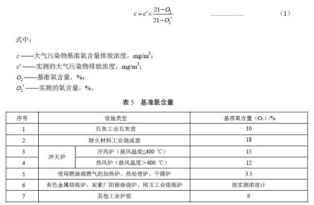 實測的工業(yè)爐窯污染物排放濃度,應(yīng)按公式(1)折算為基準(zhǔn)氧含量排放濃度。各類工業(yè)爐窯的基準(zhǔn)氧含量按表5的規(guī)定執(zhí)行。