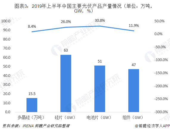 2019年上半年,由于海外市場需求旺盛的驅(qū)動,中國光伏制造端繼續(xù)保持了良好的增長態(tài)勢,主要制造企業(yè)均呈現(xiàn)生產(chǎn)端和銷售端產(chǎn)銷兩旺局面。其中,多晶硅產(chǎn)量15.5萬噸,同比增長8.4%;硅片產(chǎn)量63GW,同比增長26%;電池片產(chǎn)量51GW,同比增長30.8%;組件產(chǎn)量47GW,同比增長11.9%。