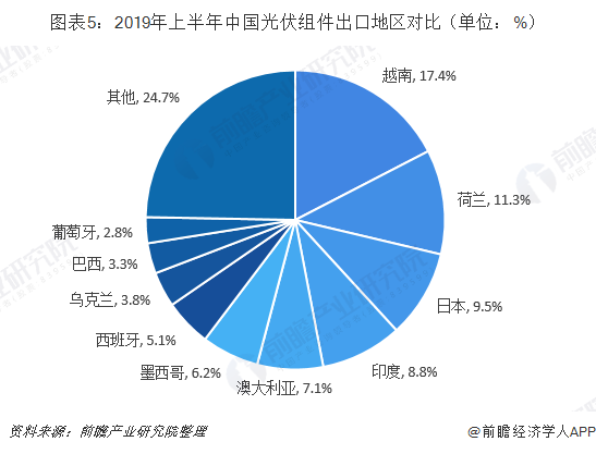 隨著歐洲市場復(fù)蘇,2019年上半年出口到荷蘭、西班牙、烏克蘭、葡萄牙、德國、比利時的組件明顯增加。此外,越南超越印度成為中國光伏產(chǎn)品出口第一大市場,主要原因在于越南總理簽發(fā)關(guān)于在越南發(fā)展太陽能發(fā)電項目鼓勵機(jī)制的決定。