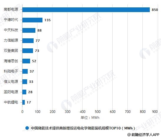 2018年,中國新增投運的電化學儲能項目中,裝機規(guī)模排名前十位的儲能技術(shù)提供商,依次為:南都電源,寧德時代、中天科技、力信能源、雙登集團,海博思創(chuàng)、科陸電子、信義電源、圣陽電源和中航鋰電。