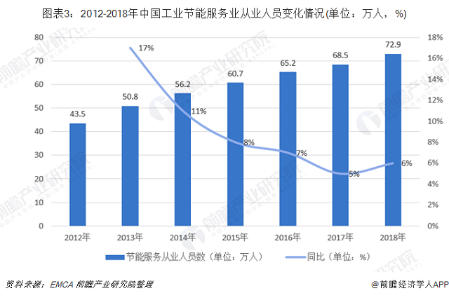 據(jù)中國(guó)節(jié)能協(xié)會(huì)節(jié)能服務(wù)產(chǎn)業(yè)委員會(huì)(EMCA)公布的統(tǒng)計(jì)數(shù)據(jù)顯示,2012-2018年中國(guó)節(jié)能服務(wù)產(chǎn)業(yè)從業(yè)人員呈現(xiàn)上升趨勢(shì)。2018年中國(guó)節(jié)能服務(wù)人員達(dá)到72.9萬(wàn)人,較2017年增長(zhǎng)6%。節(jié)能服務(wù)產(chǎn)業(yè)作為朝陽(yáng)行業(yè),吸引著眾多投資者和從業(yè)者。