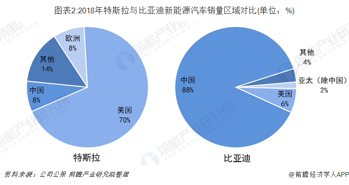 2018年特斯拉新能源汽車銷售區(qū)域主要在美國占比約70%,中國地區(qū)占比約為8%,歐洲8%,其他地區(qū)14%;而比亞迪銷售區(qū)域集中在中國,占比達(dá)88%,美國僅占6%,除中國外的亞太地區(qū)僅2%,其他地區(qū)4%。