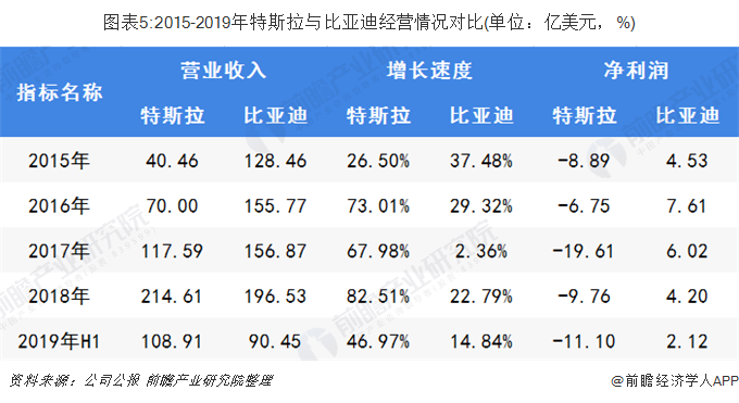 2015-2017年,比亞迪營業(yè)收入高于特斯拉,但隨著近年來特斯拉營業(yè)收入增長速度的加快,2018年,特斯拉營業(yè)收入超過比亞迪,2019年上半年,特斯拉實(shí)現(xiàn)營業(yè)收入108.91億美元,較2018年同期增長46.97%,而比亞迪2019年上半年?duì)I收達(dá)90.45億美元,營收增長率為14.84%。在營業(yè)收入上,比亞迪較特斯拉仍有待提高;2015-2018年,從整體上看,特斯拉凈利潤波動變化,連年虧損,比亞迪凈利潤雖然持續(xù)減少,但比亞迪凈利潤高于特斯拉。