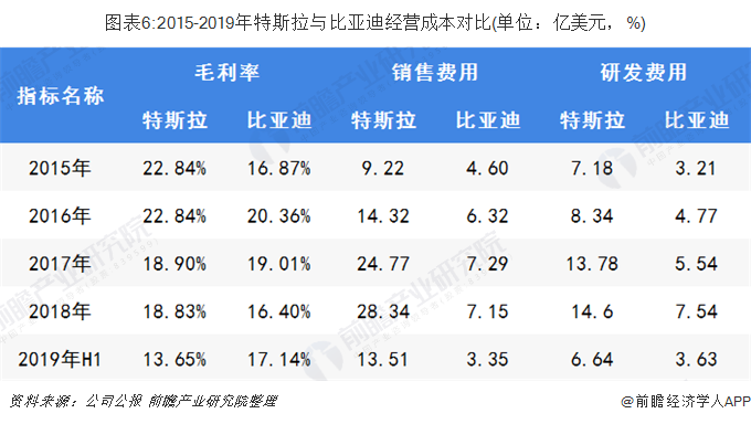2015-2018年,與比亞迪相比,特斯拉除2017年外毛利率相對較高,因2019年上半年特斯拉針對旗下車型全球范圍內(nèi)的售價,進(jìn)行了多次價格調(diào)整,其中美國和中國市場都有過多次降價,短期內(nèi)拉低了公司毛利,因此2019年上半年,特斯拉毛利率略低于比亞迪。