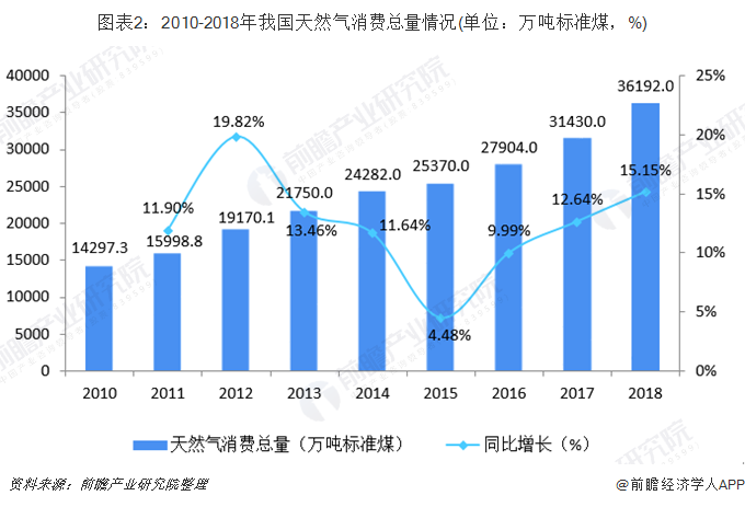 近年來,受中國的減煤增氣政策推動,天然氣成為中國近年來需求增長最快的能源產(chǎn)品。2010-2018年我國天然氣消費量迅速上升,2018年全國天然氣消費量達到36192萬噸標準煤,同比增長15.15%。預計到2050年國內(nèi)天然氣消費需求將有望增長超過8000億方,屆時天然氣在一次能源消費中的比重將提高至超過25%。