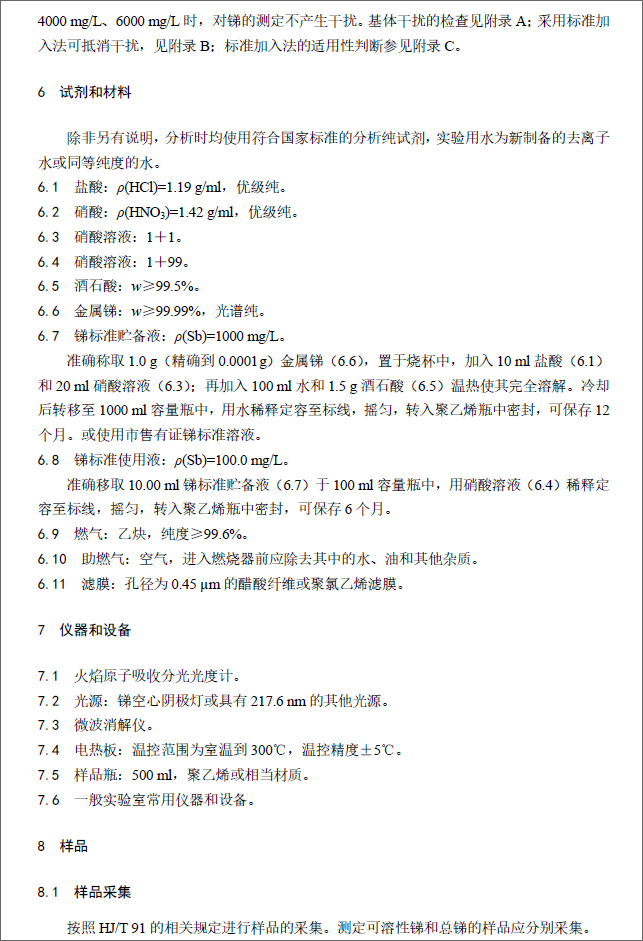 為貫徹《中華人民共和國環(huán)境保護法》和《中華人民共和國水污染防治法》,保護生態(tài) 環(huán)境,保障人體健康,規(guī)范水中銻的測定方法,制定本標準。本標準規(guī)定了測定高濃度生活污水、工業(yè)廢水和受較嚴重污染的地表水中銻的火焰原子吸收分光光度法。本標準的附錄A和附錄B為規(guī)范性附錄,附錄C為資料性附錄。本標準為首次發(fā)布。