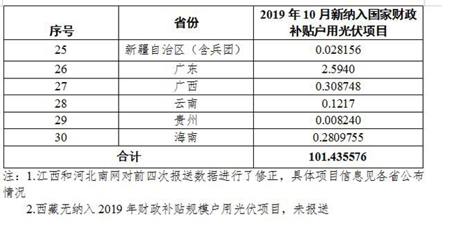 根據(jù)各省級能源主管部門、電網(wǎng)企業(yè)報(bào)送信息,經(jīng)國家可再生能源信息管理中心梳理統(tǒng)計(jì),2019年10月新納入國家財(cái)政補(bǔ)貼規(guī)模戶用光伏項(xiàng)目總裝機(jī)容量為101萬千瓦。詳細(xì)情況見附表。
