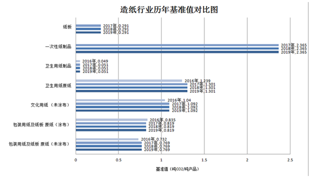 2019年度造紙行業(yè)配額分配基準(zhǔn)線基準(zhǔn)值較2018年度沒(méi)有變化,歷年基準(zhǔn)值對(duì)比如下: