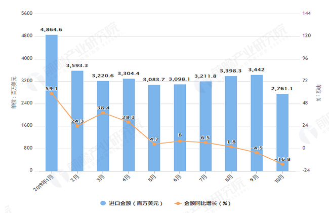 2019年1-10月中國天然氣進口量及金額增長情況表