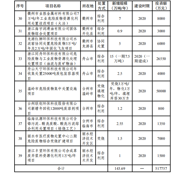 2019年-2020年,浙江省計(jì)劃新(擴(kuò))建100個(gè)危險(xiǎn)廢物利用處置設(shè)施建設(shè)項(xiàng)目,總投資近99億元。