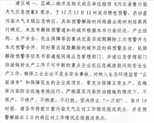 日前,河北發(fā)布《關(guān)于啟動(dòng)區(qū)域一和區(qū)域二重污染天氣橙色預(yù)警和Ⅱ級(jí)應(yīng)急響應(yīng)的通知》,詳情如下: