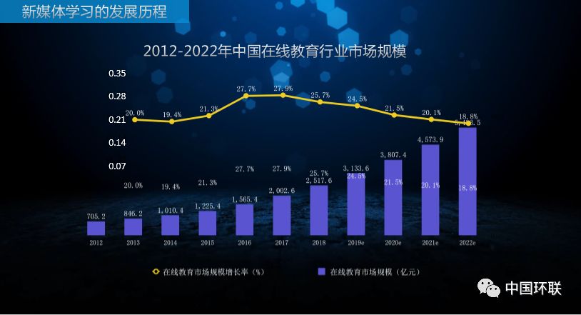 中國在線教育行業(yè)的市場規(guī)模發(fā)展上,已由2012年的705.2億元增長至2018年的2517.6億元,并基本保持20%以上的年增長率,預(yù)計(jì)到2022年可突破5000億元。2019年H1中國在線教育的市場細(xì)分結(jié)構(gòu)上,以高等學(xué)歷教育為主,占比49.6%;其次為職業(yè)培訓(xùn),占比25.5%;K12教育占比20.7%。當(dāng)前新媒體學(xué)習(xí)的用戶粘性持續(xù)加強(qiáng),使用場景更加碎片化,線上學(xué)習(xí)已成為最主流的知識(shí)獲取方式。