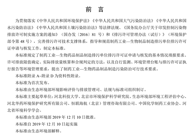 為貫徹落實(shí)《中華人民共和國環(huán)境保護(hù)法》《中華人民共和國大氣污染防治法》《中華人民共和國水污染防治法》《中華人民共和國土壤污染防治法》等法律法規(guī)、《國務(wù)院辦公廳關(guān)于印發(fā)控制污染物排放許可制實(shí)施方案的通知》(國辦發(fā)〔2016〕81號)和《排污許可管理辦法(試行)》(環(huán)境保護(hù)部令第48號),完善排污許可技術(shù)支撐體系,指導(dǎo)和規(guī)范制藥工業(yè)—生物制品制造排污單位排污許可證申請與核發(fā)工作,制定本標(biāo)準(zhǔn)。
