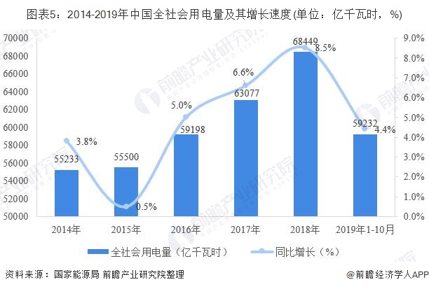 我國(guó)作為電力生產(chǎn)大國(guó),同時(shí)也是電力消耗大國(guó),近年來(lái),我國(guó)全社會(huì)用電量持續(xù)提升。根據(jù)國(guó)家能源局發(fā)布2018年全社會(huì)用電量等數(shù)據(jù)顯示,2018年,全社會(huì)用電量68449億千瓦時(shí),同比增長(zhǎng)8.5%。創(chuàng)2014年以來(lái)增速新高。