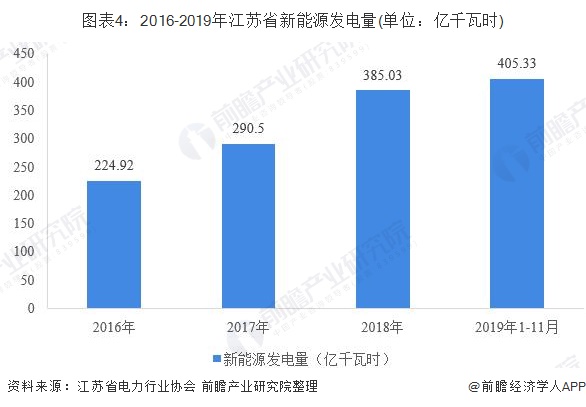 2019年1-11月份,江蘇全省發(fā)電量4605.06億千瓦時(shí),其中新能源發(fā)電量405.33億千瓦時(shí),占全省發(fā)電量的8.80%。